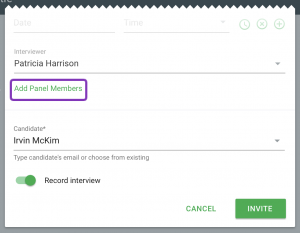 To invite interviewers click on the "Add Panel Members" button in the "Set up live interview" form. The interviewer can select panel interviewers from their team members.