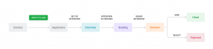 The talent acquisition funnel comes with seven successive stages built-in. As the hiring team conducts interviews, scores the results and makes a hiring decision, candidates are automatically moved to the appropriate stage.